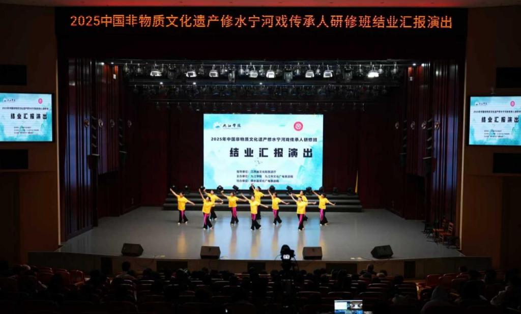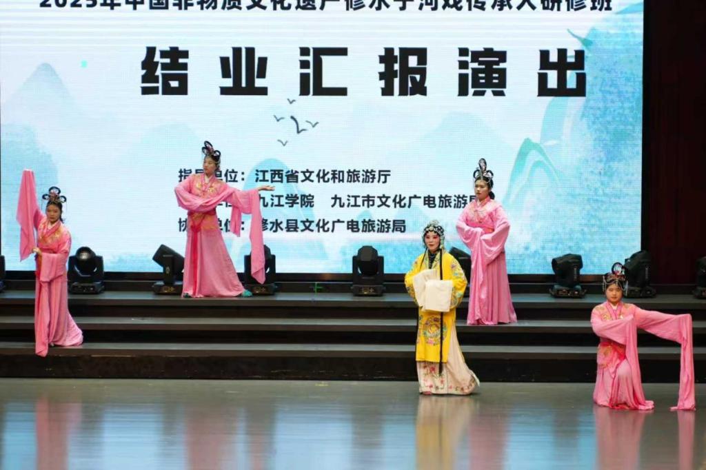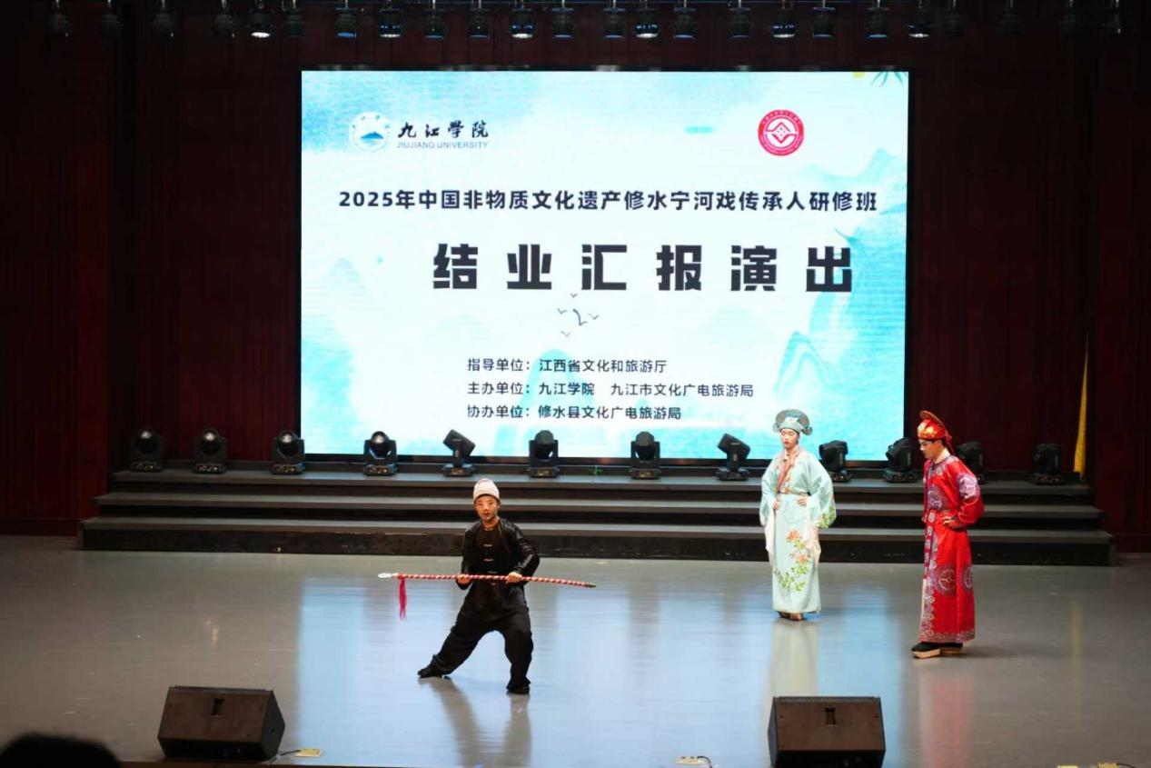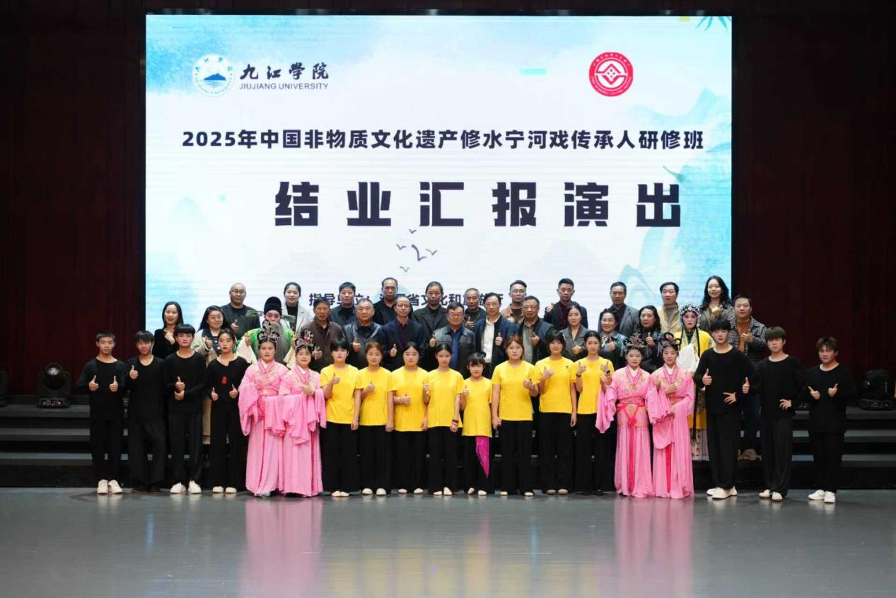 11月9日,中国非物质文化遗产修水宁河戏传承人研修班结业汇报演出在艺术学院音乐厅举行。汇报演出以网络直播和现场观看两种形式结合进行。艺术学院党政班子、修水县文旅局领导及学院师生一起观看了演出。本次活动以“传承非遗文化,推广民族语言”为主题,通过现场演出与网络直播相结合的方式,生动展现了宁河戏的语言艺术魅力与深厚文化内涵,充分体现了国家语言文字推广基地(九江学院)在推动语言文字事业与中华优秀传统文化传承融合中的积极作用。